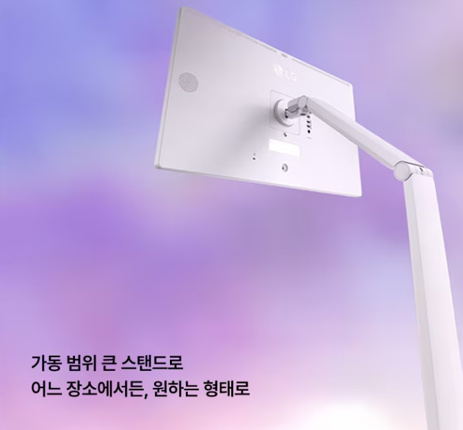 바닥까지 내릴 수 있고, 화면도 아래쪽으로 깊게 숙여지기 때문에 소파에 누워서 영화 보기, 수직 촬영용 모니터링, 세로 영상 시청(쇼츠, 리스, 인스타)에도 아주 유용합니다.